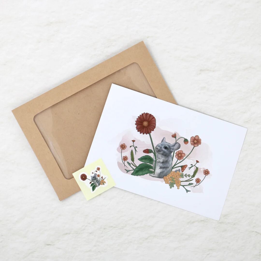 チンチラのメッセージカード、額縁風封筒、チンチラ柄シールのセットです。